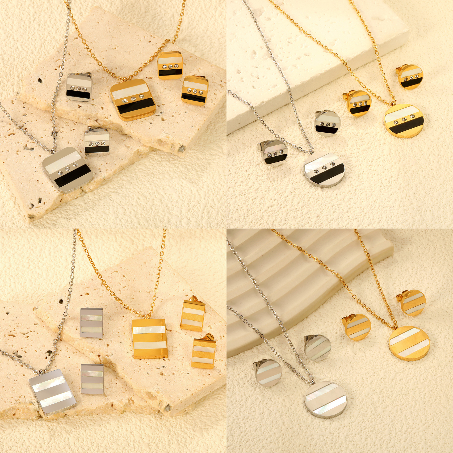 European and American Popular Geometric Sticky White Shell Pendant Necklace Ins Style Rectangular Round Earrings Stainless Steel Jewelry Set