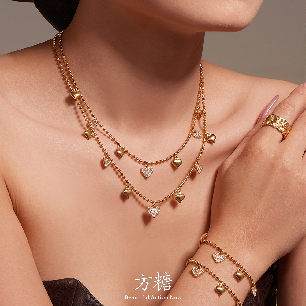 Stainless Steel Flat Snake Bone Chain Heart-Shaped Diamond Bow Pendant Necklace Bracelet Vacuum Gold-Plated Fashion Jewelry Set