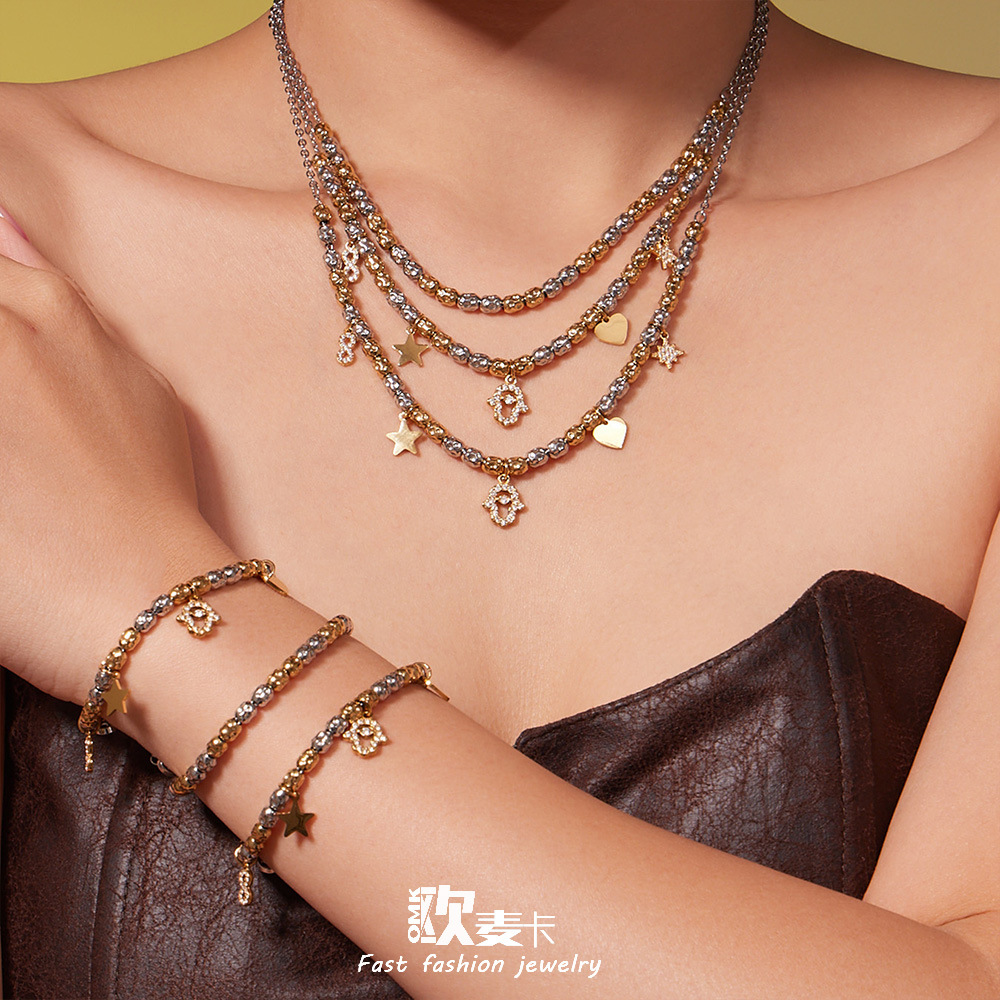 Omaca Ocean Style DIY Multi-Pendant Full Diamond Zircon Pendant Necklace Bracelet Set Stainless Steel Plated with 18K Real Gold