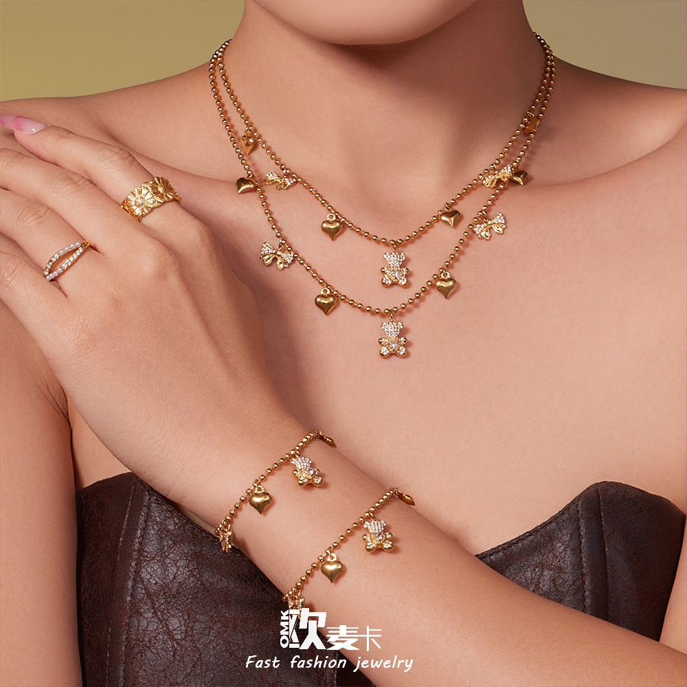 Stainless Steel Heart-Cut Bread Edge Glass Stone Steel Ball Necklace Bracelet Earrings Set Plated with 18K Real Gold That Does Not Fade