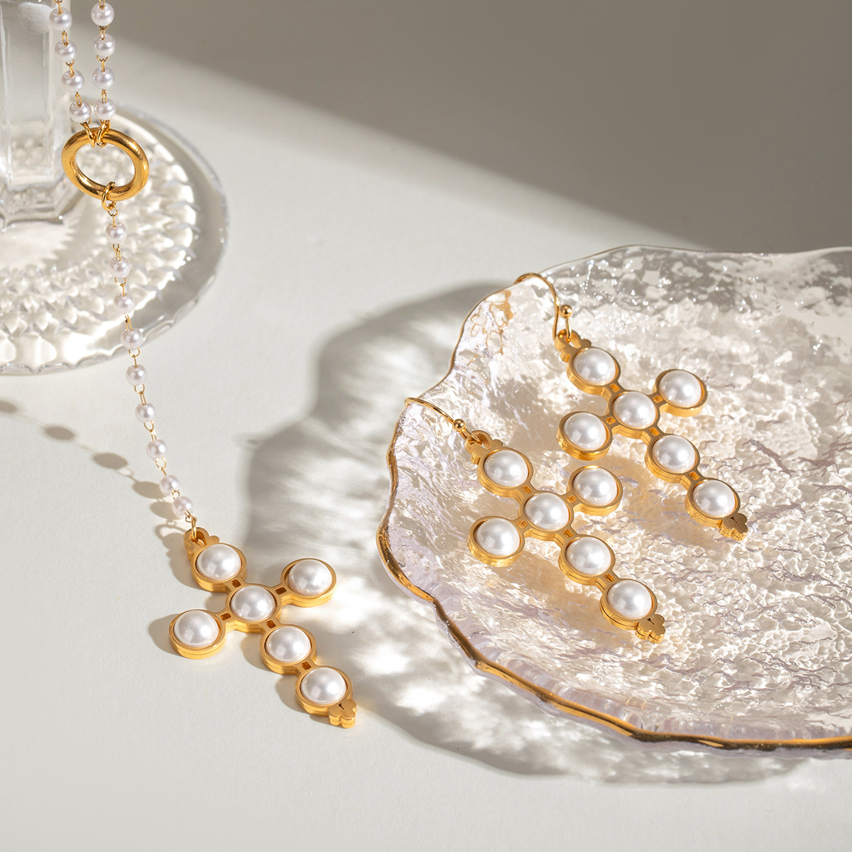 Wanxing Cross-border New Explosions Cross Necklace suit 18k Gold Retro Elegant Pearl Earrings Y-word Necklace