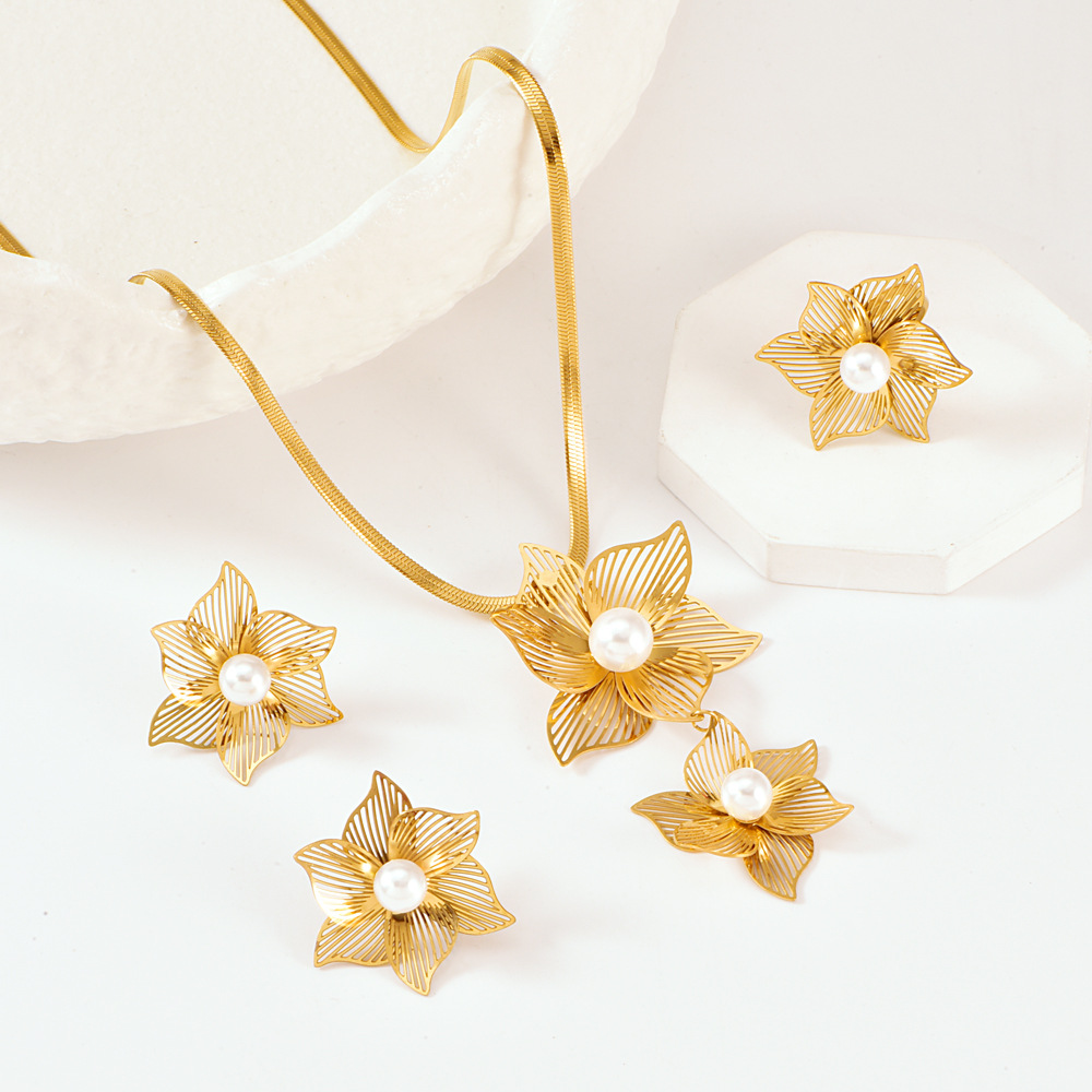 European and American Style Round Bead Hollow Flower Sweater Chain High-End Light Luxury Earrings Open Ring Rhinestone Necklace Set