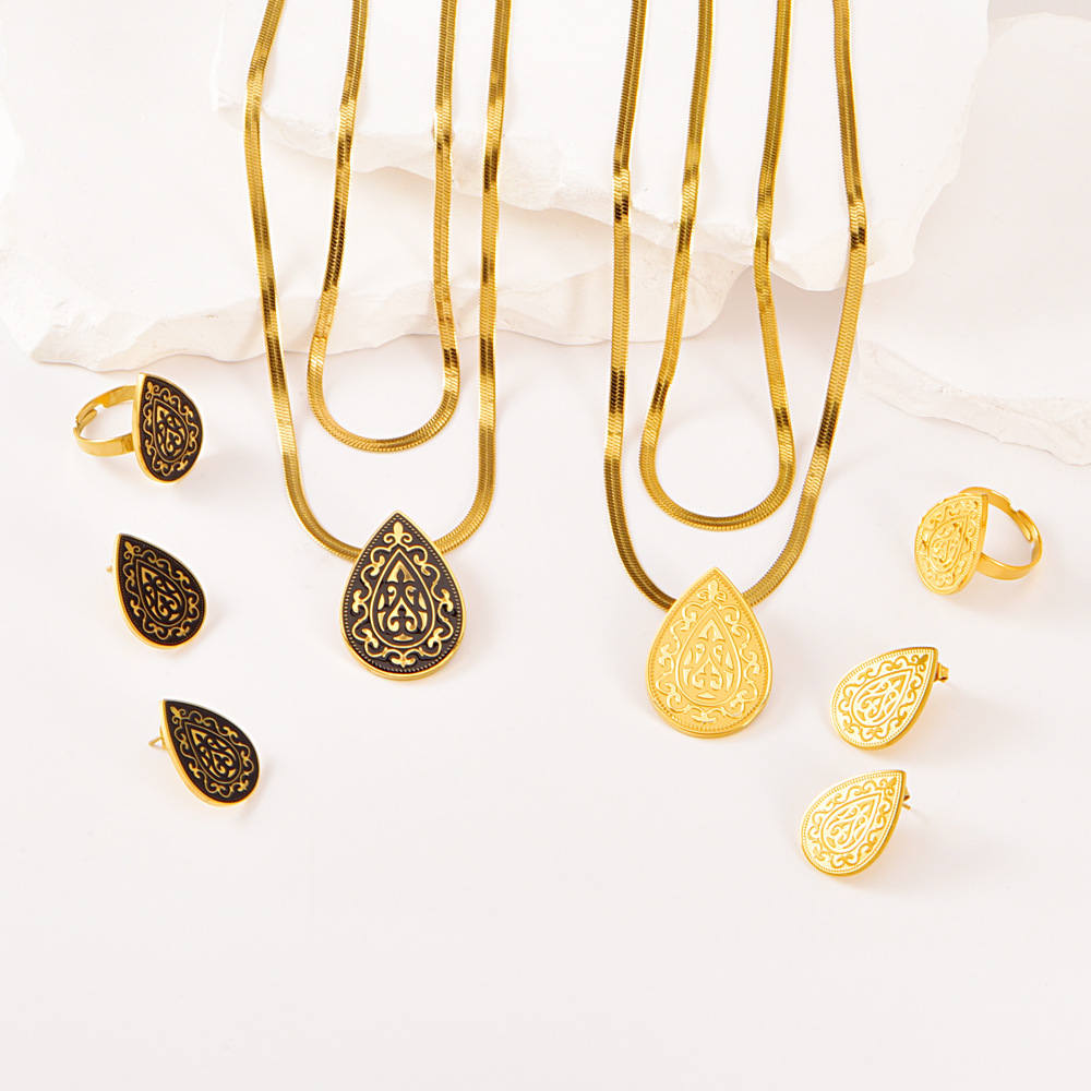Cross-Border Retro Pattern Water Drop Two-In-One Clavicle Necklace Versatile Elegant Earrings Gold Glue Stacking Set for Women