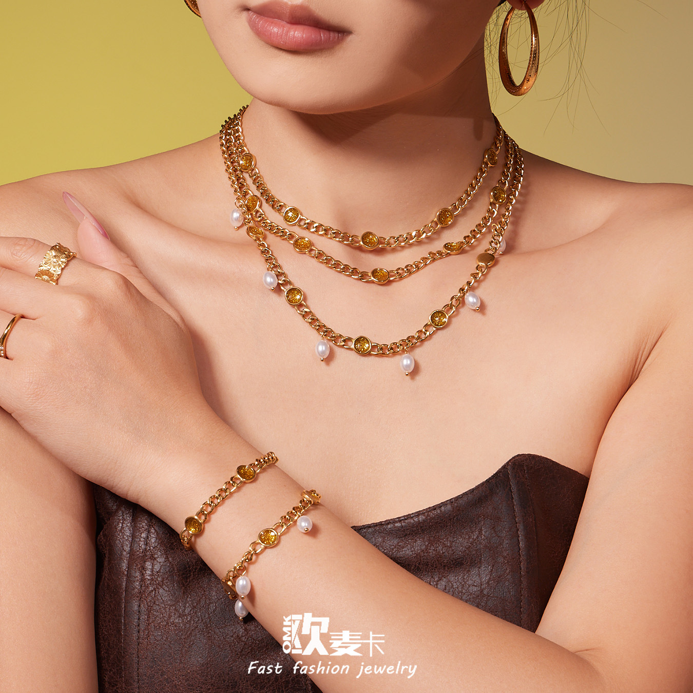 European and American Best-Selling Imitation Pearl Tassel Necklace Bracelet Stainless Steel Plated 18K Gold Ins Niche Design Jewelry Set