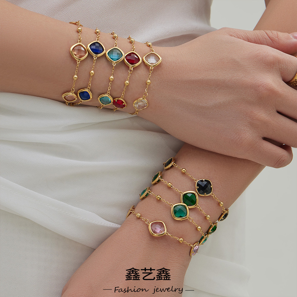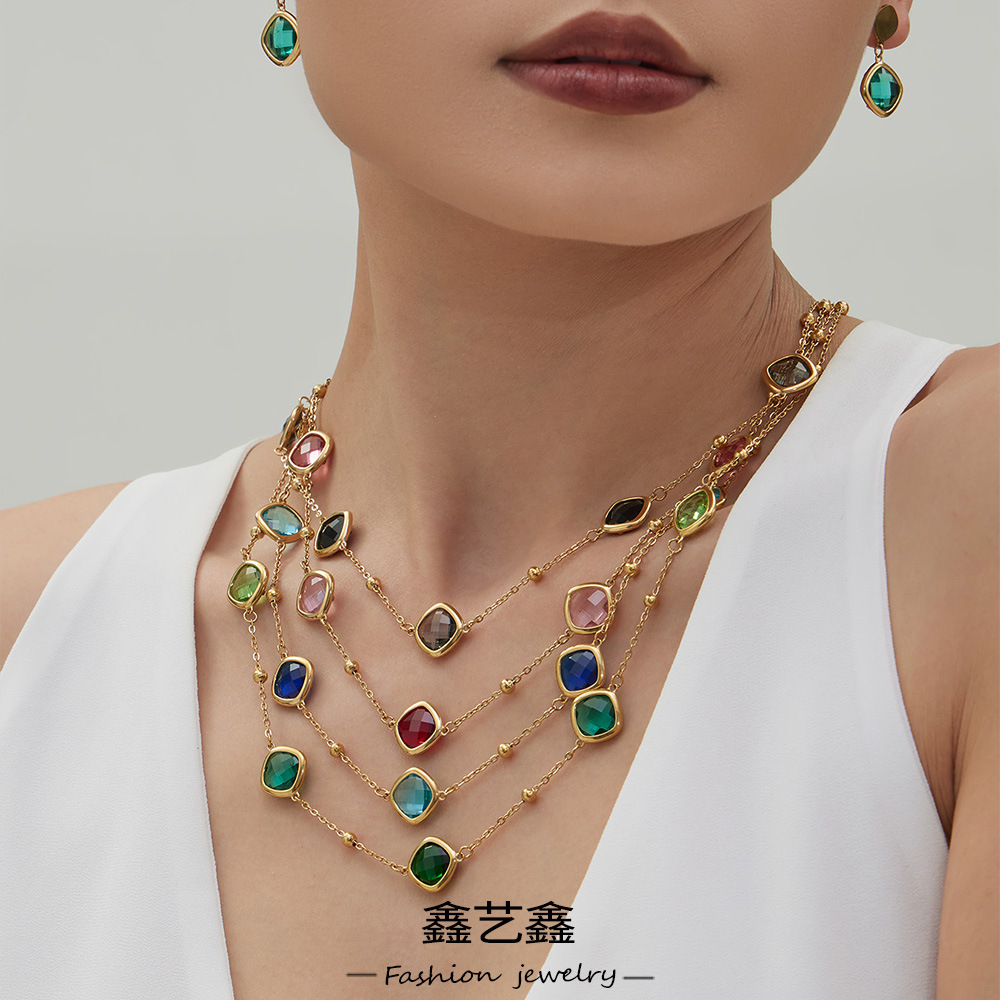 Stainless Steel Square Faceted Glass Stone Bracelet Necklace Earrings Set European and American Trendy Cool Elegant Jewelry