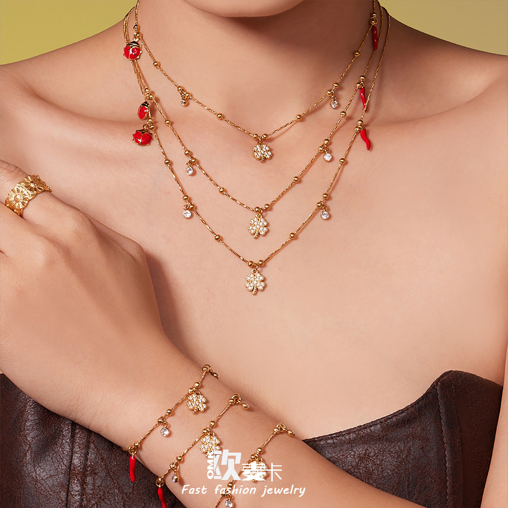 Stainless Steel 5A Zircon Clover Ladybug Multi-Accessory Bracelet Necklace Jewelry Set Plated with 18K Real Gold That Does Not Fade