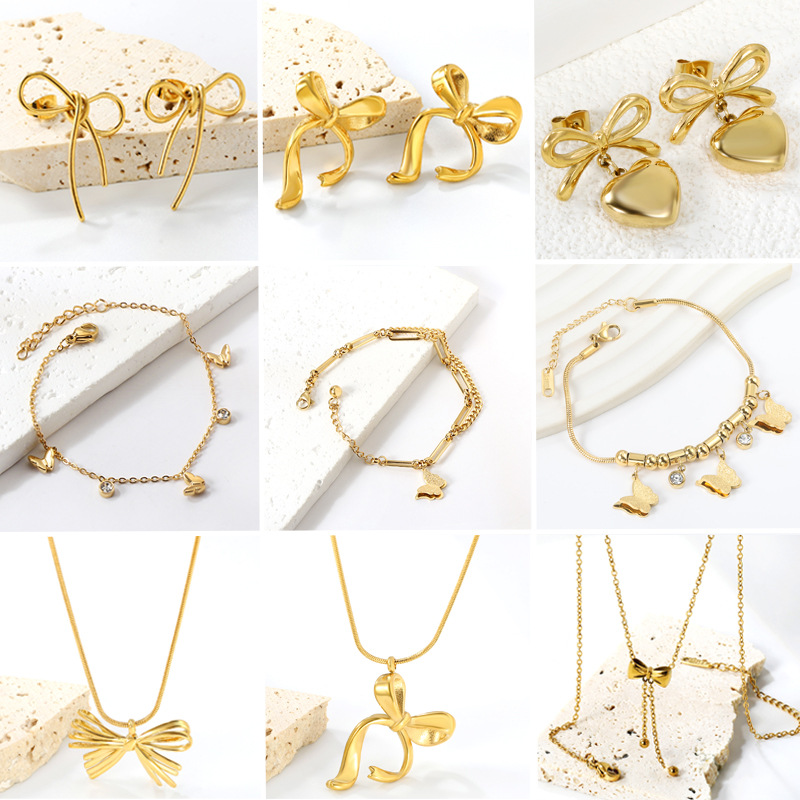 Cross-Border Hot-Selling French Elegant Bow Earrings Necklace Jewelry Set Stainless Steel Bracelet Jewelry Wholesale