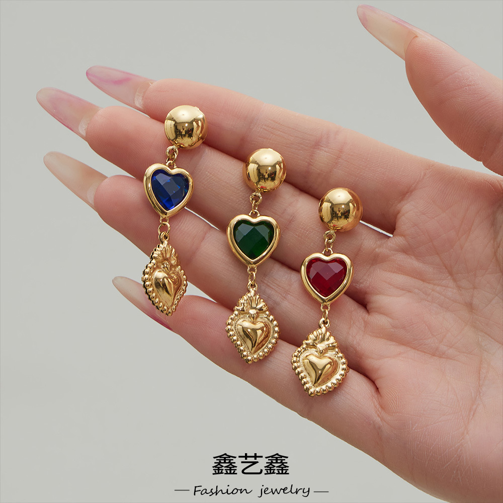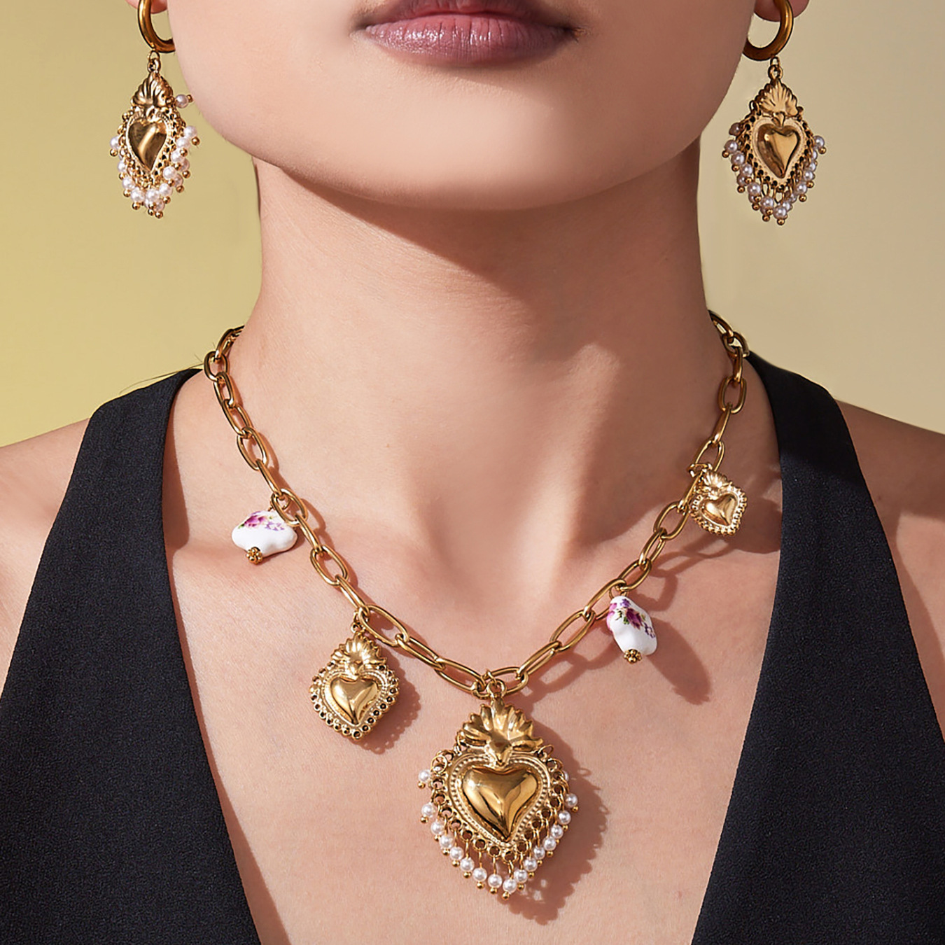 Stainless Steel Heart Natural Stone Necklace Earrings Plated with 18K Gold Ins European and American Multi-Pendant Fashion Versatile Jewelry Set