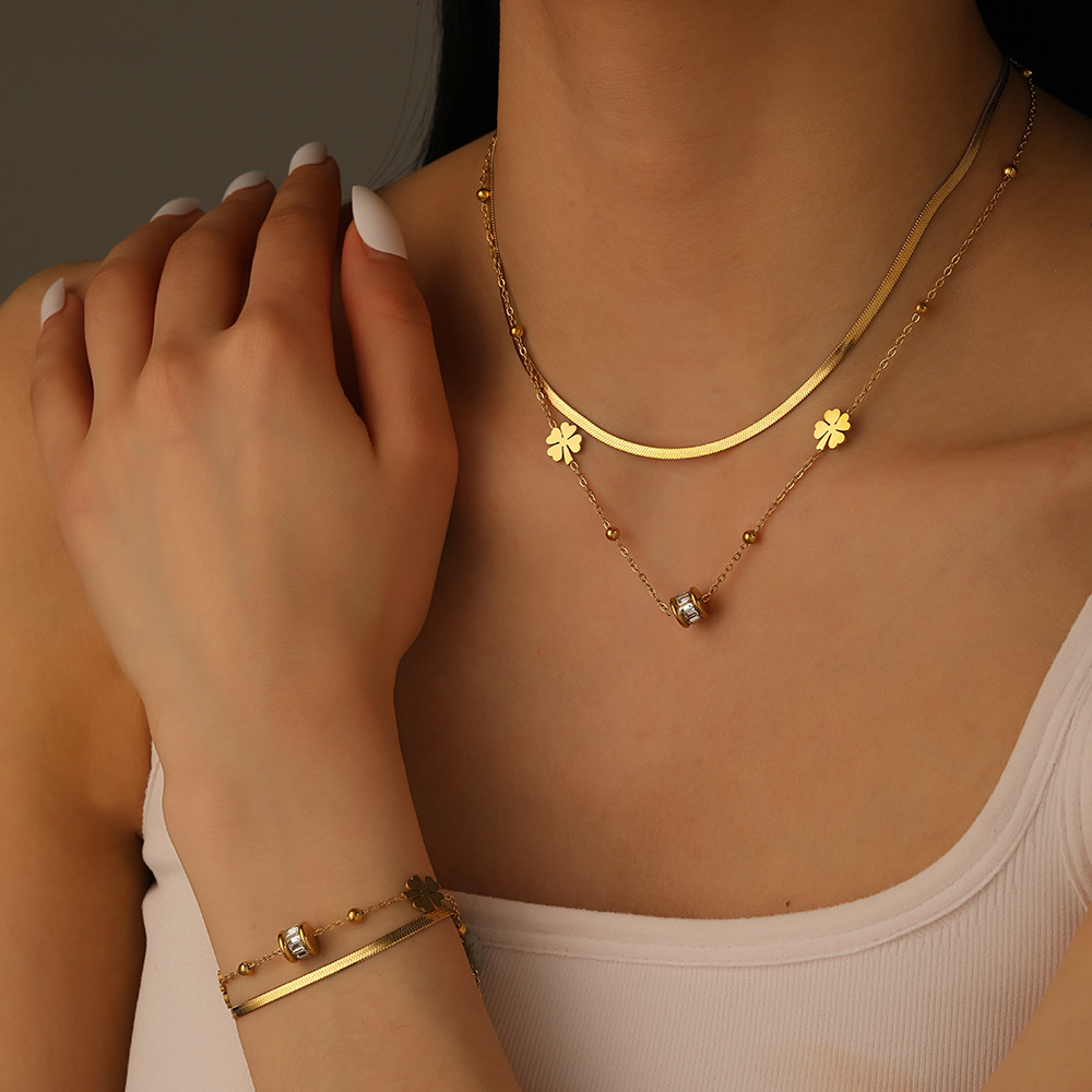 Stainless steel blade double-layer bead four-leaf flower jewelry European and American non-fading stainless steel transfer bead jewelry suit