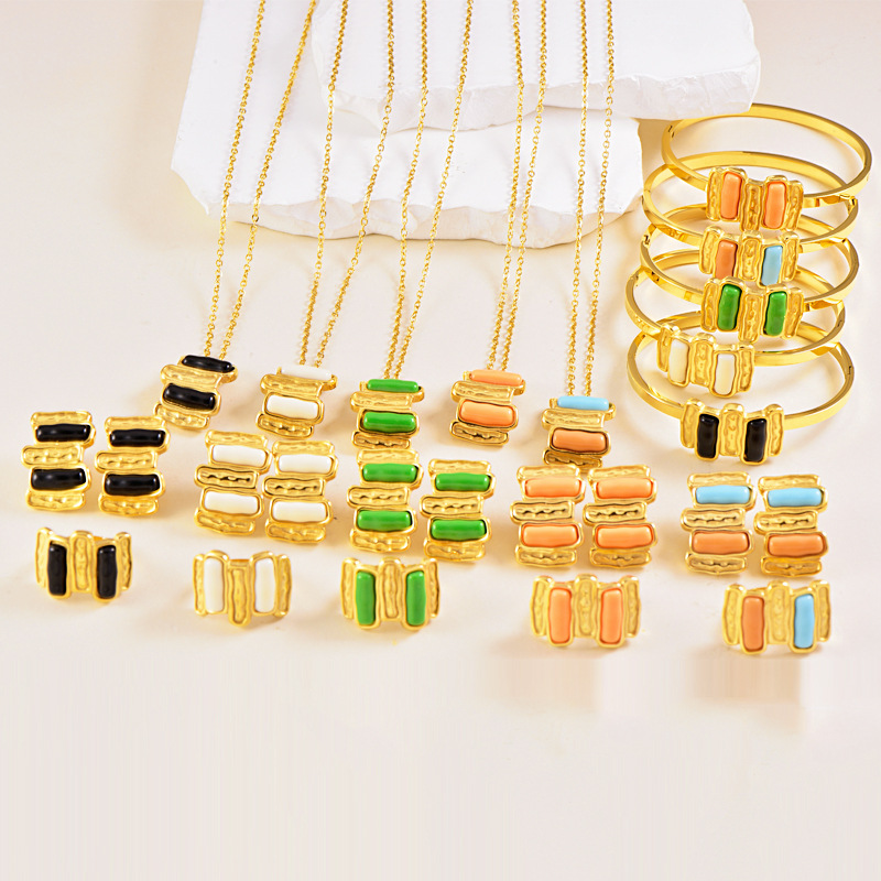 High-grade rectangular color stone four-piece simple retro stud earrings stainless steel bracelet clavicle necklace suit