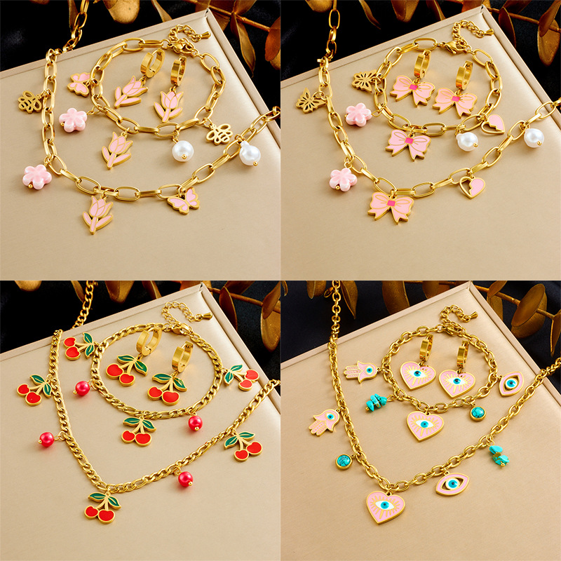 New European and American Sweet and Fresh Colorful Flower Butterfly Pendant Decorative Stainless Steel Necklace Bracelet Earrings Set