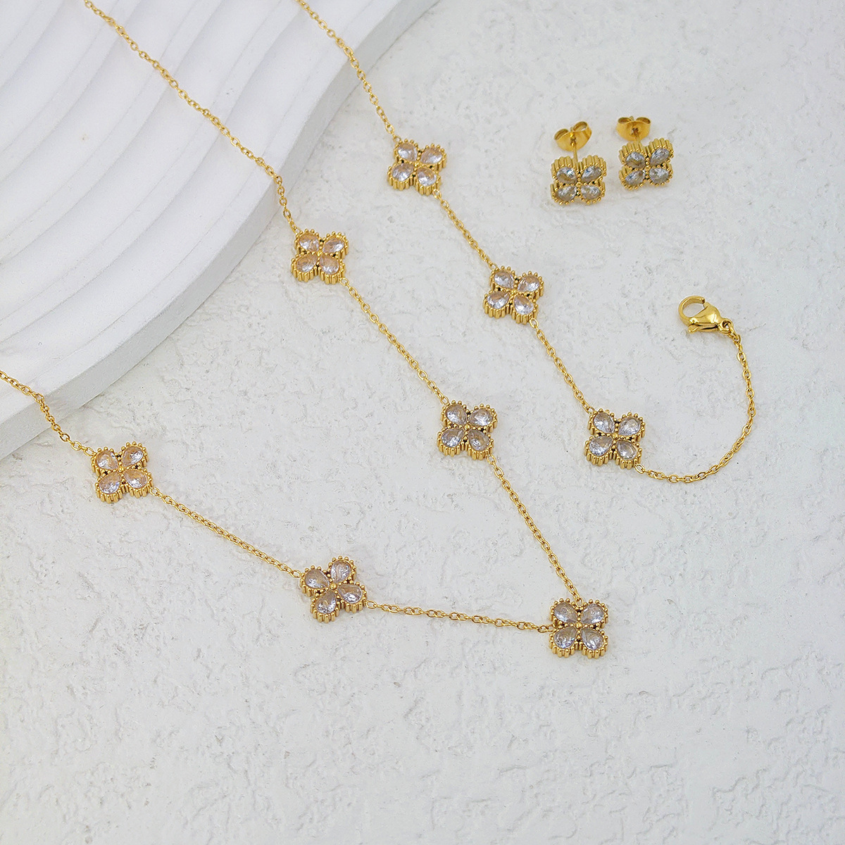 Four-Leaf Clover Five-Flower Zircon Flower Stainless Steel Necklace Set Plated with 18K Gold Simple Cross-Border Spot Titanium Steel Jewelry