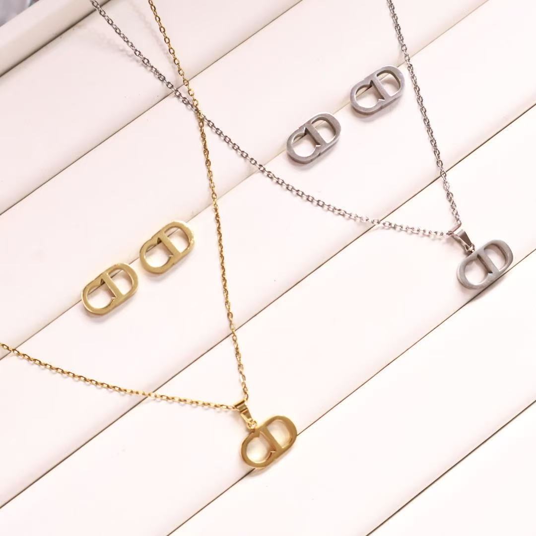 Fashion High-grade Light Luxury Exquisite Necklace Earrings suit Pig Nose CD Letter Thin Chain Stainless Steel Temperament suit