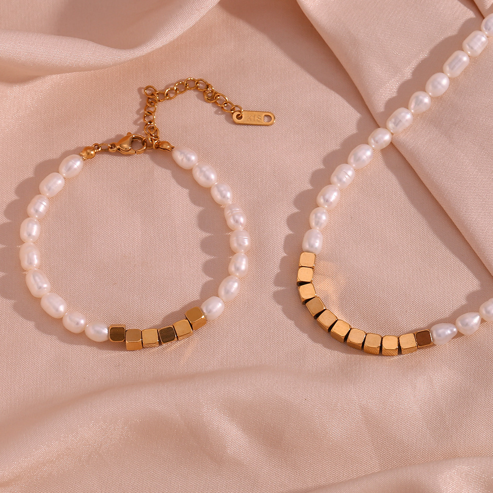 European and American Fashion Personality Temperament Explosion Beaded Bracelet Set Women's Stainless Steel Square Freshwater Rice Beaded Necklace