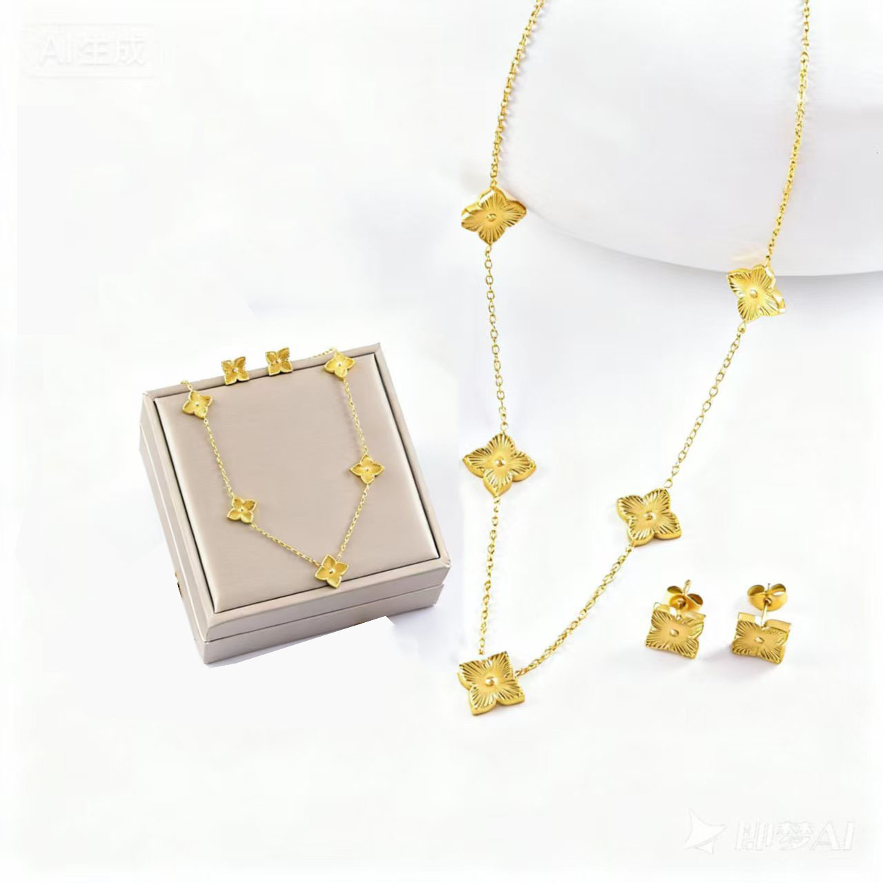 Cross-Border Hot-Selling Single-Sided Laser Stripesd Rhombus Flower Four-Leaf Clover Bracelet Necklace Earrings Set 18K Titanium Steel Jewelry