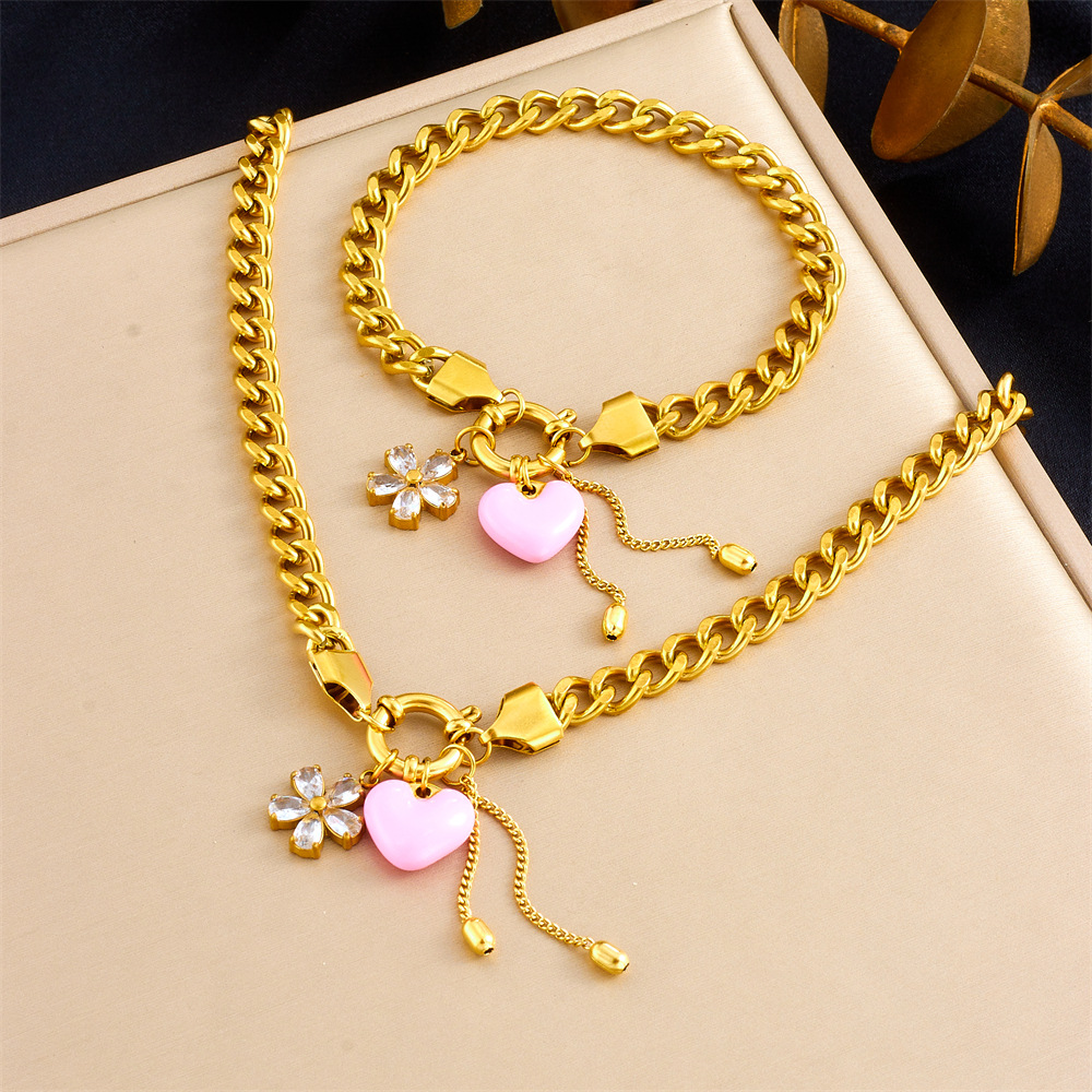 Cross-border fashion new stainless steel gold-plated 18K chain diamond flower powder love pendant tassel jewelry suit