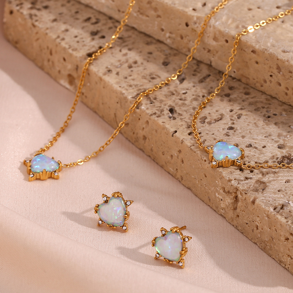 European and American Fashionable Retro Earrings Bracelet Set Stainless Steel Gold-Plated Peach Heart Opal Pendant Necklace for Women