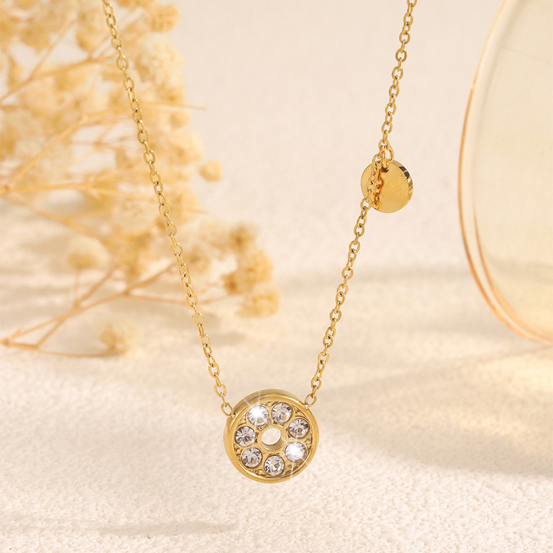 Korean Style New Titanium Steel Necklace for Women, Full Diamond Hollow Disc Pendant Jewelry Set, High-End Non-Fading Jewelry