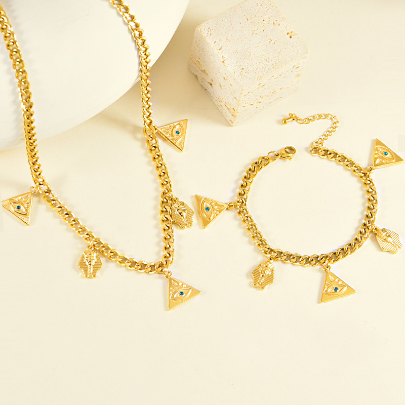 Vintage Triangle Pyramid Diamond Eyes Necklace Egyptian Pharaoh Bracelet Exotic Stainless Steel Jewelry suit