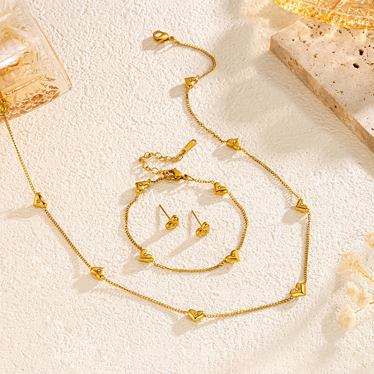 New Three-Heart Titanium Steel Bracelet Necklace Light Luxury Fashion 18K Real Gold Plated Non-Fading Stainless Steel Set Wholesale