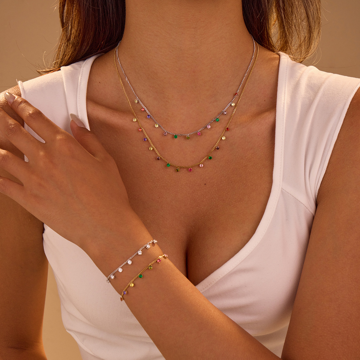 European and American cross-border jewelry suit stainless steel necklace bracelet color zircon tassel pendant niche all-match clavicle chain