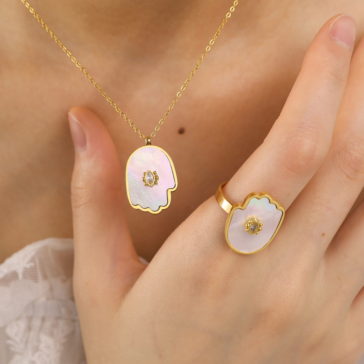 Cross-border Hot Devil's Eye Zircon suit Jewelry Women's Titanium Steel Gold Plated Palm Set Shell Pendant Necklace Wholesale