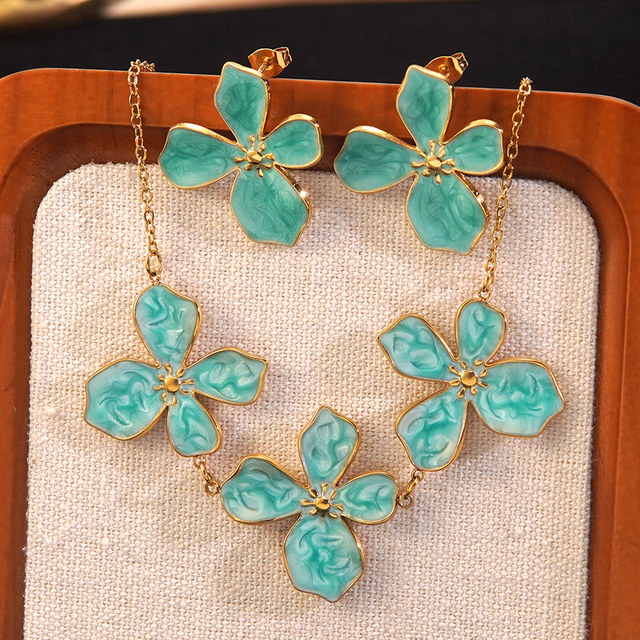 European and American Cross-Border Oil Dripping Flower Necklace Earrings Retro Personality Versatile Stainless Steel Flower Necklace Set Wholesale