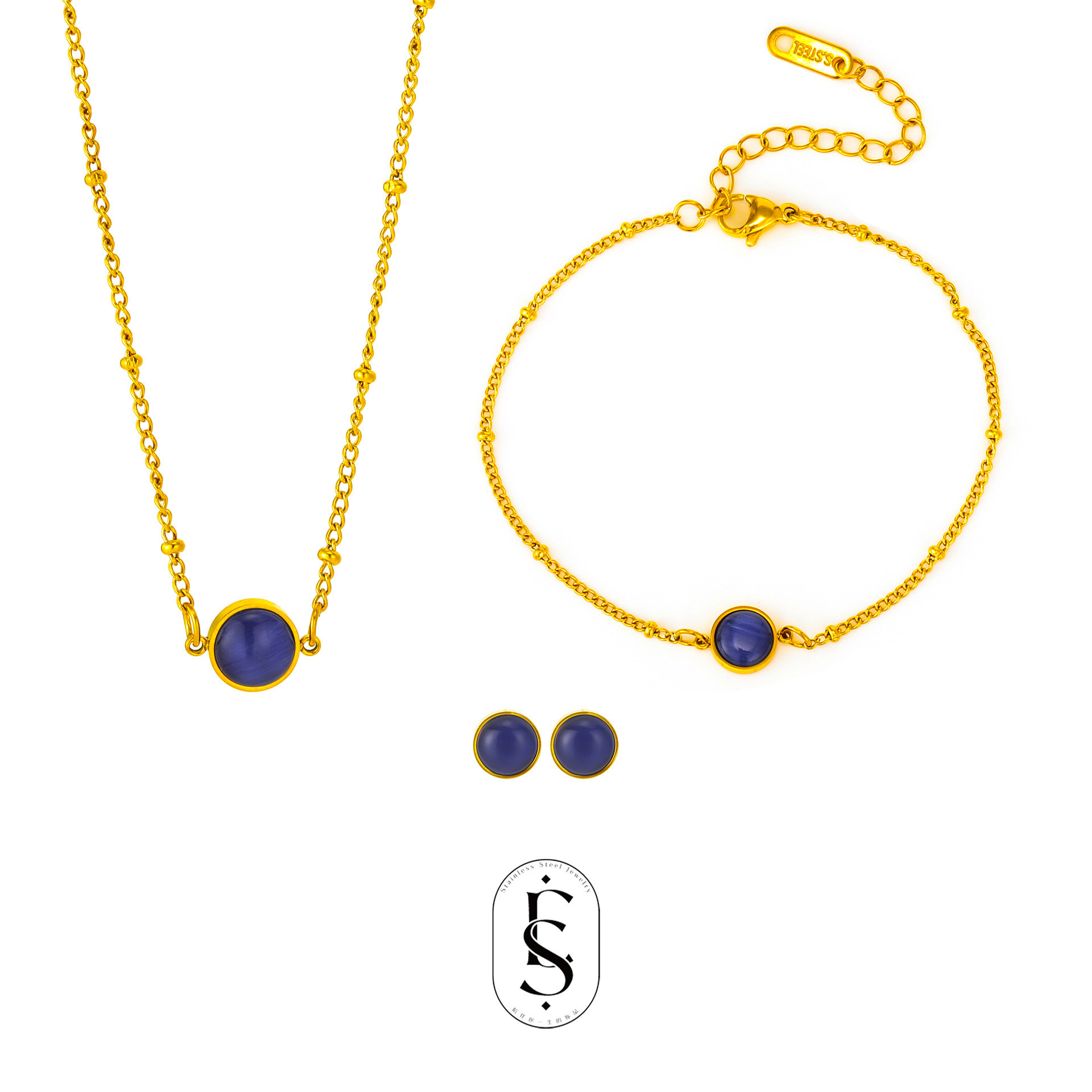Cross-Border Ins Style French Retro Stainless Steel Transfer Blue Cat's Eye Necklace Bracelet Earrings Set for Women Plated with 18K Gold