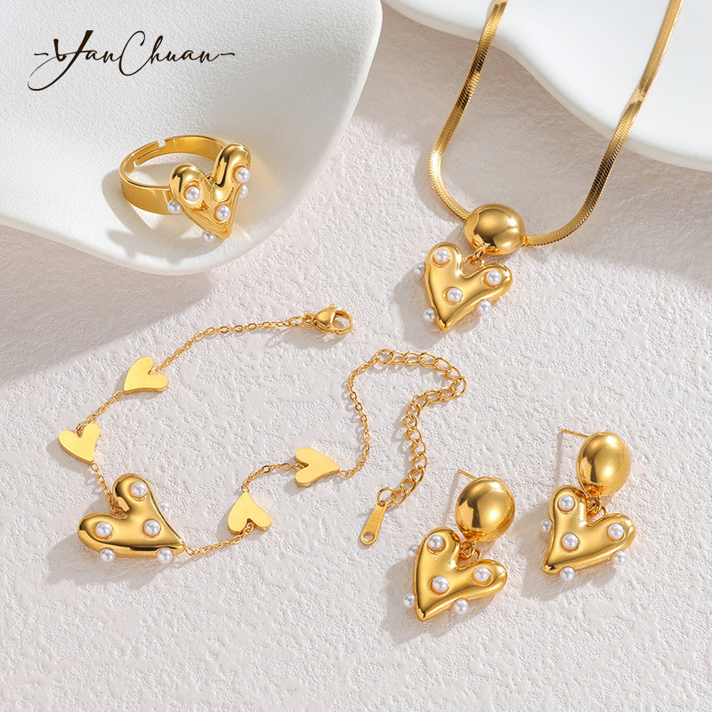 Fashion Simple French Style Retro Pearl Love Gold Plated Stainless Steel O-Chain Bracelet Earrings Necklace suit