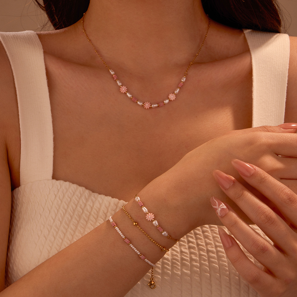 European and American Cross-Border 18K Baroque Pearl Pink Dopamine Beaded Necklace Bracelet Set Stainless Steel Clavicle Chain