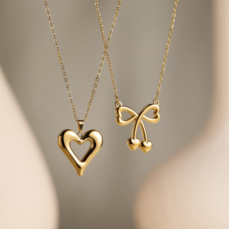 Cross-Border European and American French Gold Stainless Steel Three-Dimensional Heart Bow Cherry Pendant Necklace Clavicle Chain Wholesale for Women