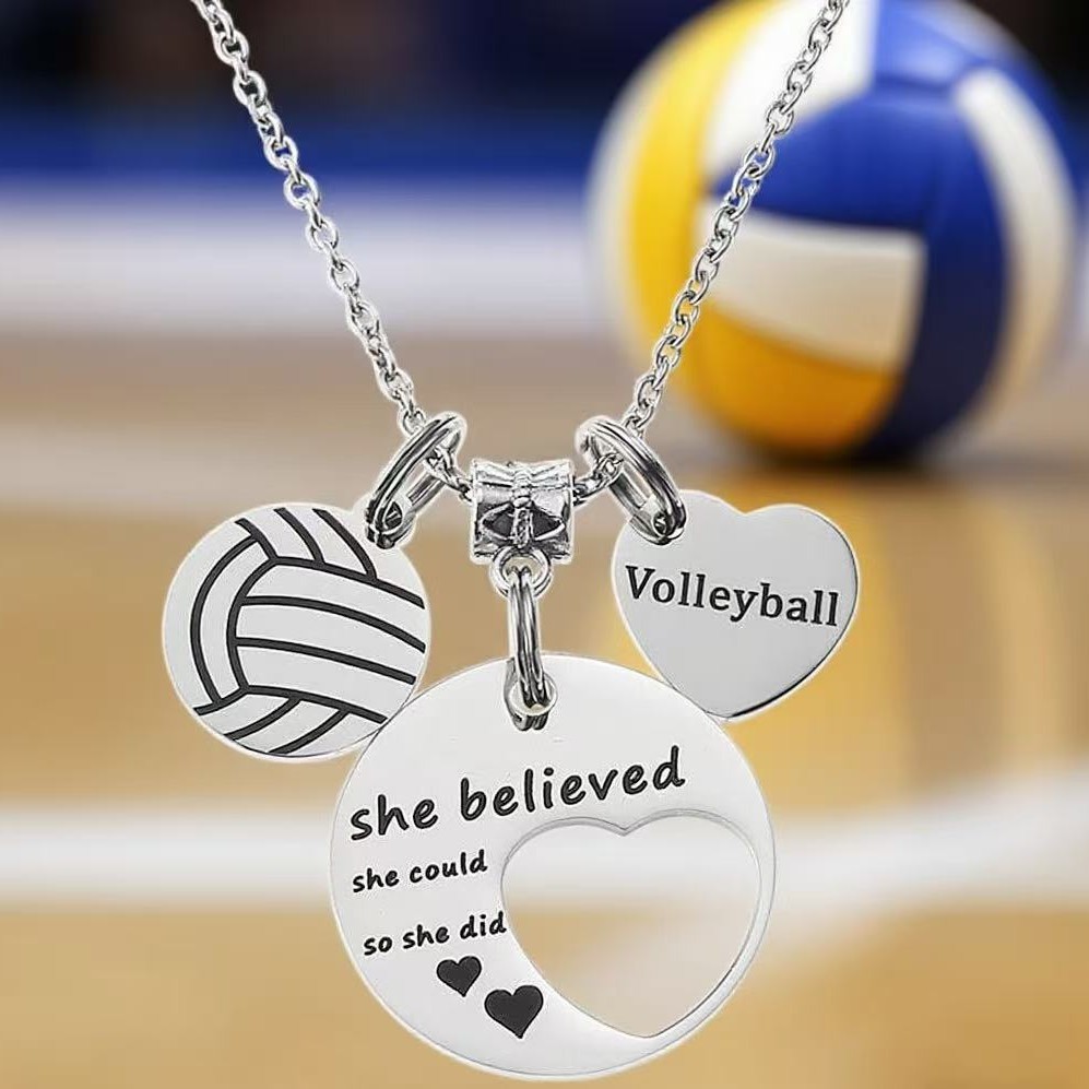 Sports Heart Pendant Necklace Football Volleyball Softball Pendant Basketball Stainless Steel Basketball Round Medal Necklace