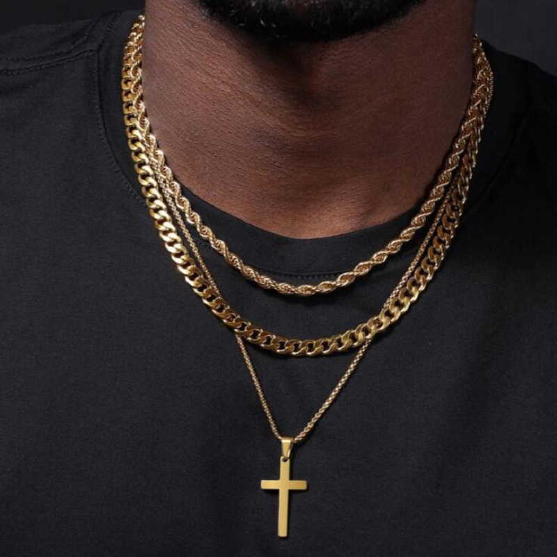 Cross-Border New Cool Style Stainless Steel Cross Pendant Three-Layer Necklace Personalized Hip-Hop Trendy Twist Chain Necklace