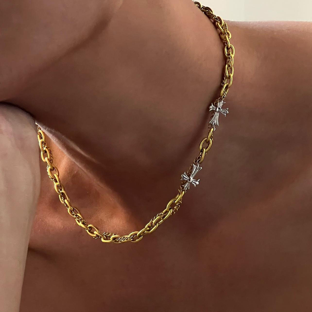 Cross California Matte Gold Double-Layer Stainless Steel Necklace for Men, Hip-Hop Niche Design, Vintage Versatile Clavicle Chain for Women