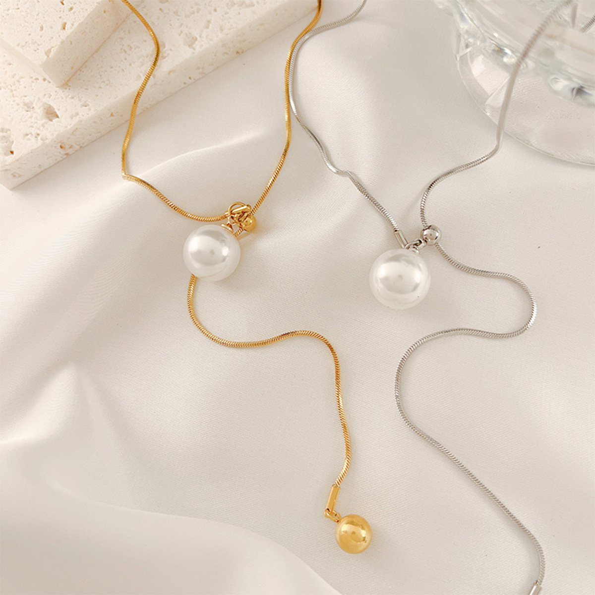 A delicate imitation pearl 2023 New Fashion necklace stainless steel long sweater chain pull-out decorative chain personality