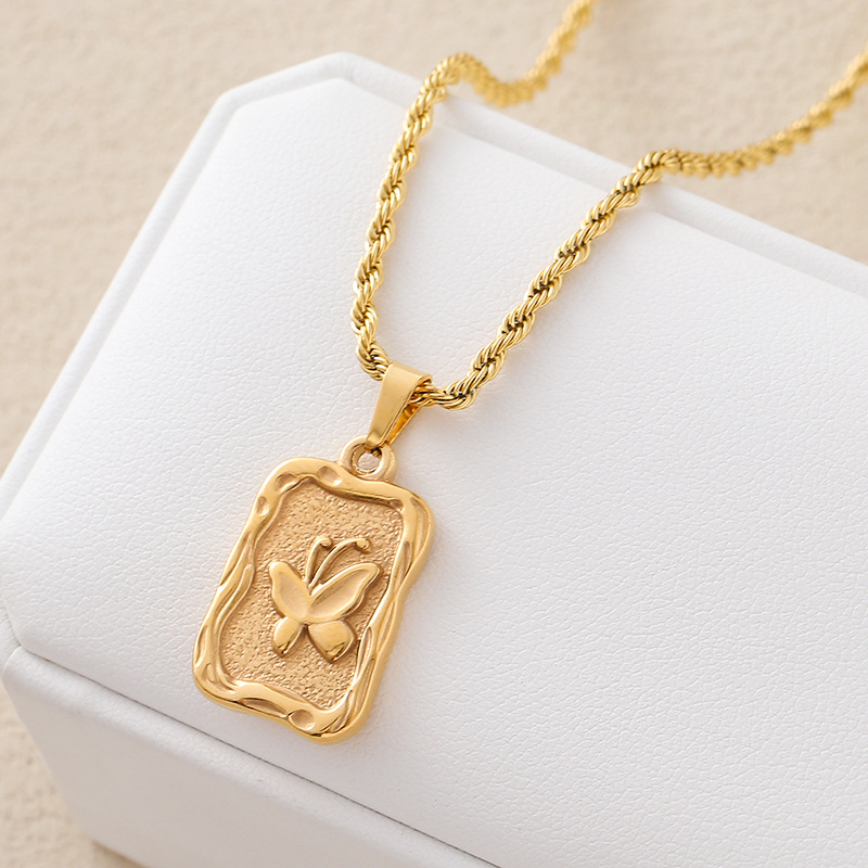 Retro stainless steel embossed butterfly square pendant niche non-fading titanium steel necklace diy jewelry pendant wholesale