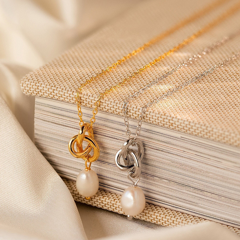 Cross-Border European and American Valentine's Day Pearl Necklace Versatile Heart Knot Stainless Steel Chain Plated 18K Real Gold Pendant Necklace for Women