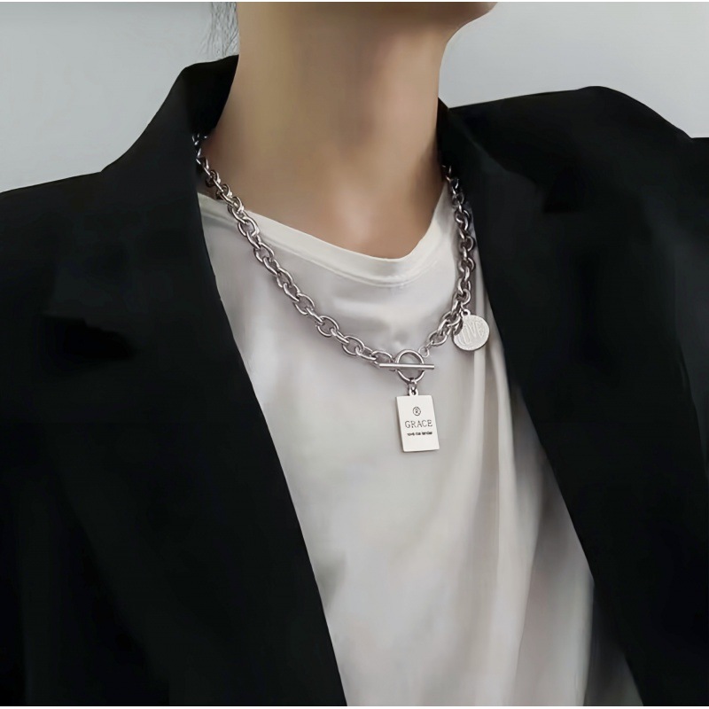Harajuku dark style hiphop round square stainless steel letter short necklace combination titanium steel men's and women's clavicle chain TO chain