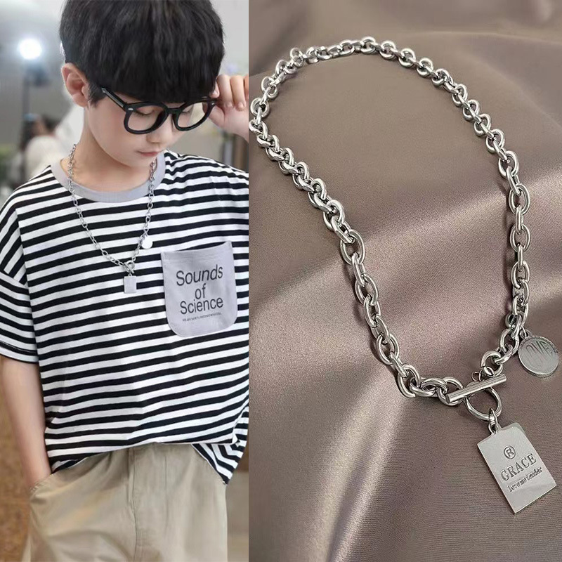 Ins Letter Square Pendant Children's Necklace for Girls Trendy Cool Versatile Stylish Pendant for Boys Personalized Street Dance Runway Clothing Accessory