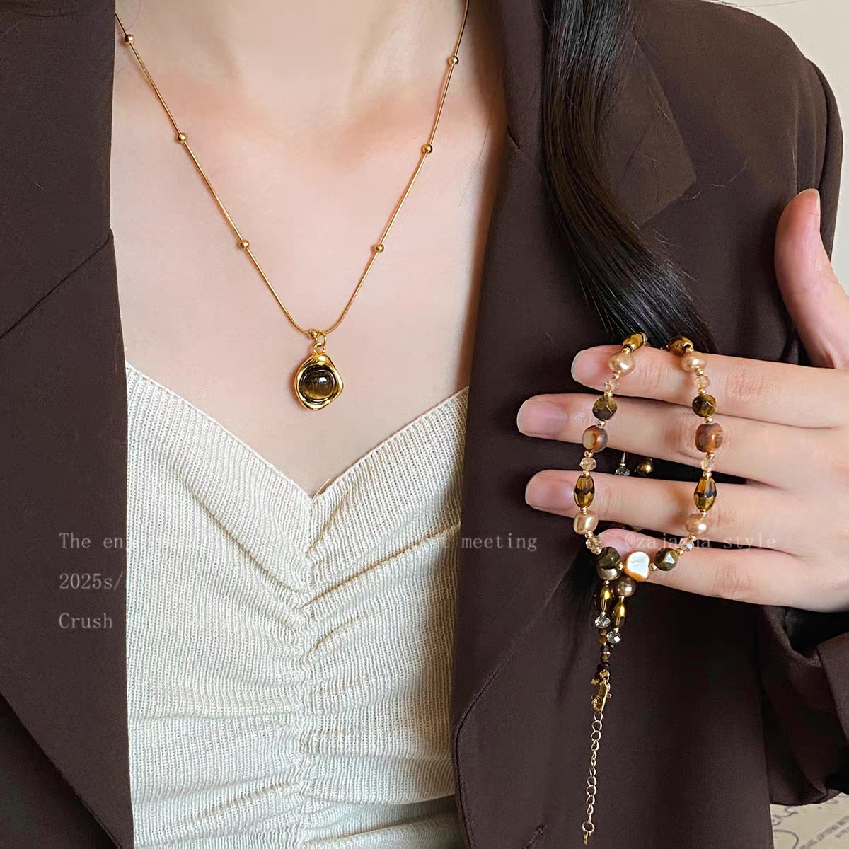 Autumn and Winter Maillard Beaded Tiger Eye Stone Pendant Necklace Women's Retro Sweater Chain Double Layer Stacked High-End Accessories