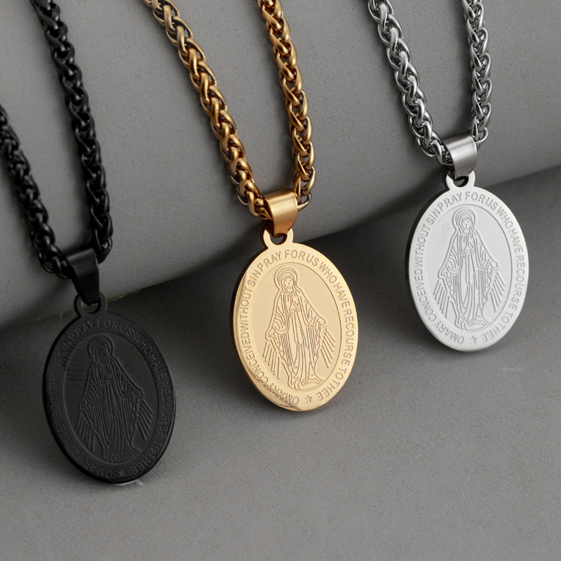 Cross-Border Hot Selling Stainless Steel Retro Oval Virgin Mary Pendant Men's and Women's Medal Necklace Titanium Steel Jewelry Wholesale