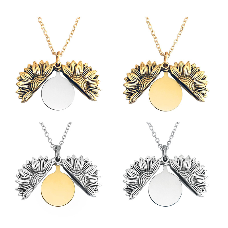 Necklace European and American Cross-Border Sunflower Stainless Steel Round Plate Blank Wordless Material Holiday Gift Engraved Metal Necklace