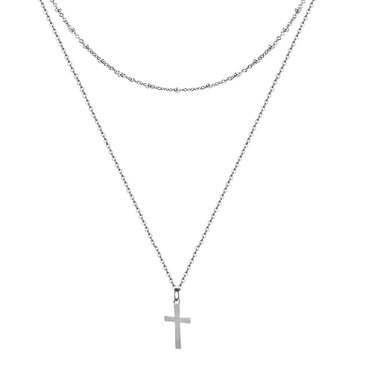 Korean Style Fashion Simple Cross Pendant Double Layer Necklace Stainless Steel Bead Chain Clavicle Chain Hundred Tower Jewelry