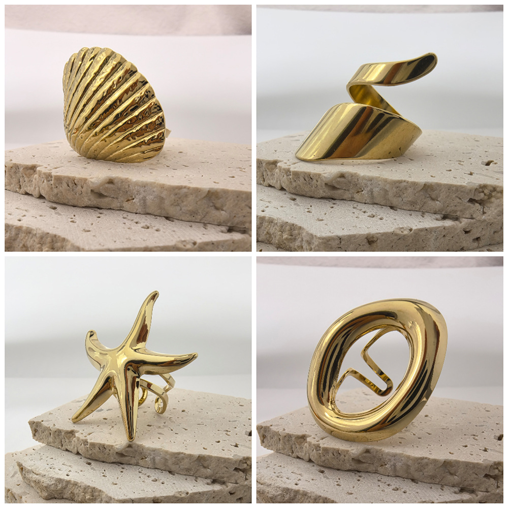 European and American Cross-border 18K Gold Geometric Stainless Steel Ring 2025 Summer Beach Scenery Face Starfish Shell Ring