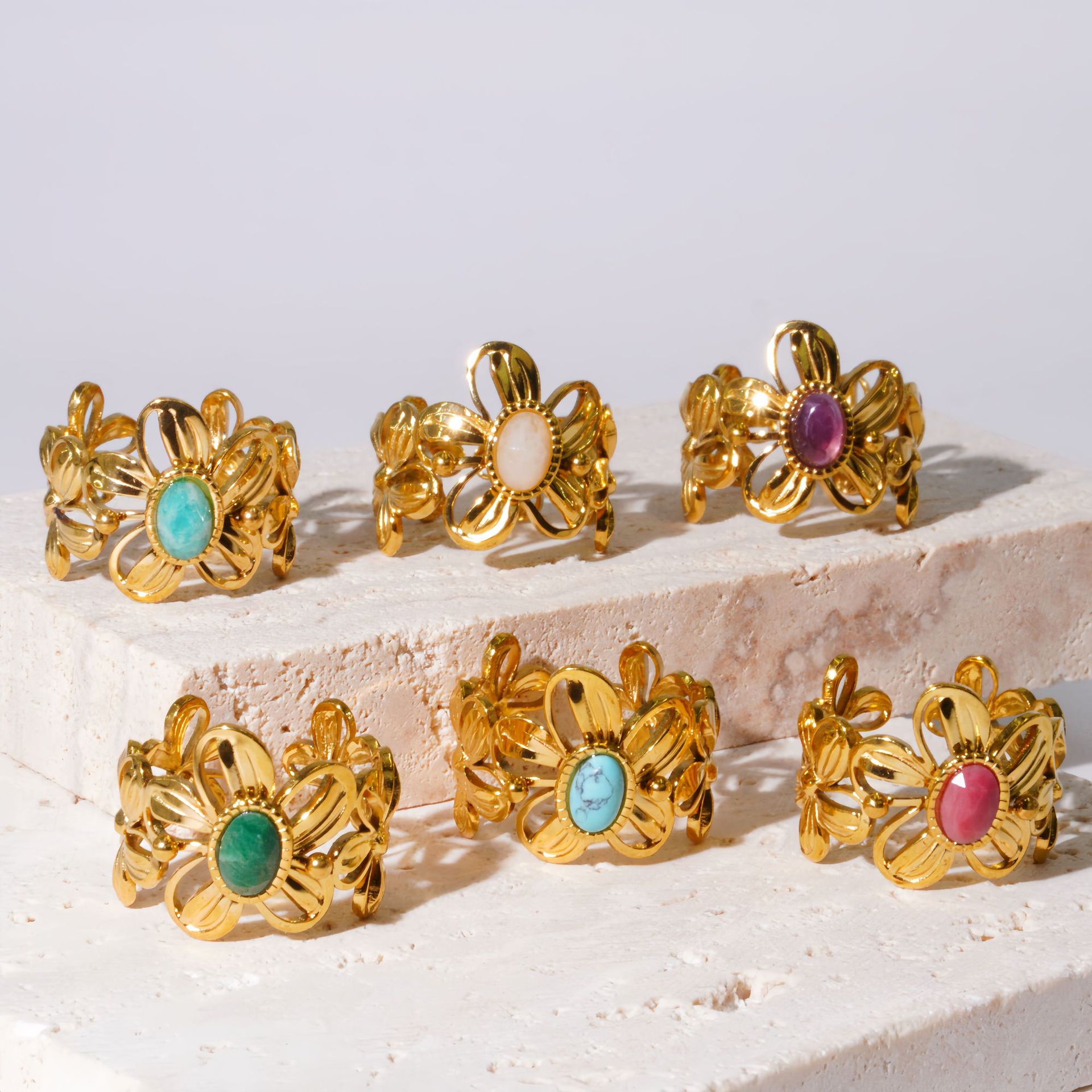 French Flower Inlaid Natural Stone Stainless Steel Ring Open Ring Light Luxury Design High-End Non-Fading Jewelry Ring