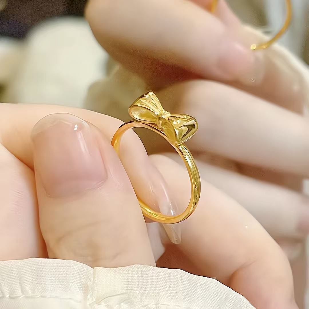 Non-Fading Fashionable Simple Titanium Steel Gold-Plated Bow Ring for Women Versatile Sweet Style Stainless Steel Ring Hand-Polished