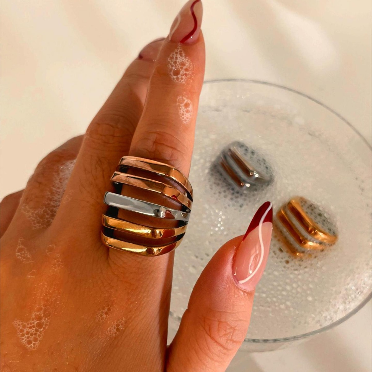 French European and American fashion stainless steel multilayer hollow color 18K gold waterproof design personality Joker ring women