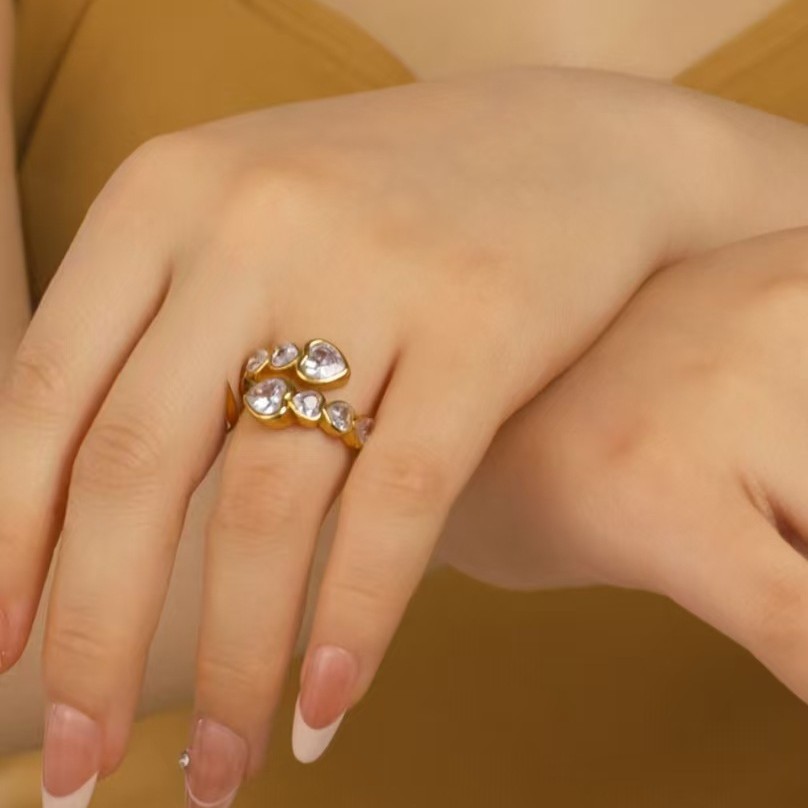 European and American Cross-Border Hot Selling Personalized Design Trendyy Diamond-Encrusted Stainless Steel Plated 18K Gold Open Peach Heart Zircon Ring for Women