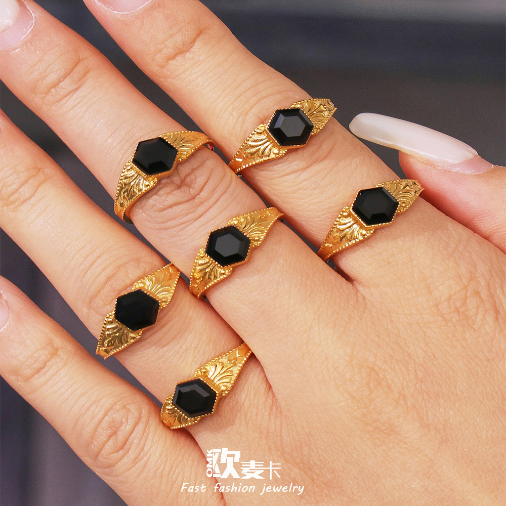 Ancient-Style Ring, Stainless Steel Jewelry, 18K Plated, Non-Fading, High-Grade Resin, Black Diamond, Niche Design, Letter