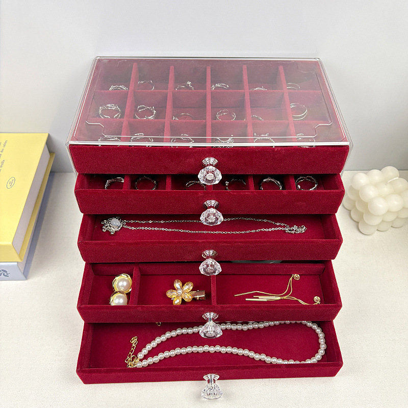 Rose Red Velvet Multi-Layer Jewelry Box Anti-Oxidation Ring Earrings Necklace Dust Box Multi-Functional Storage and Organization Box